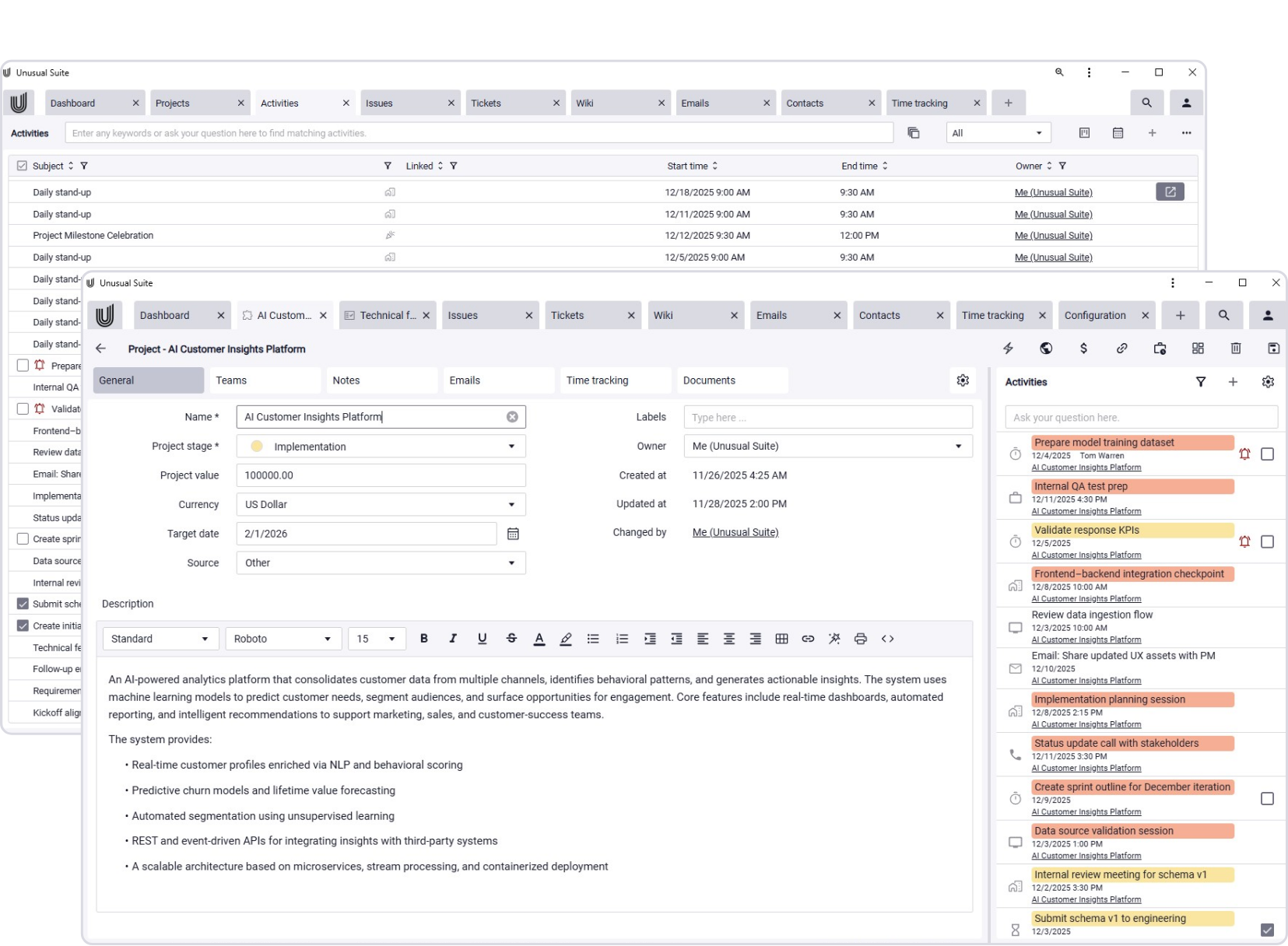 The Unusual Suite offers a central activities module with multiple views, prioritization options, and reminders. Tasks are not managed in isolation but are fully embedded within the CRM.