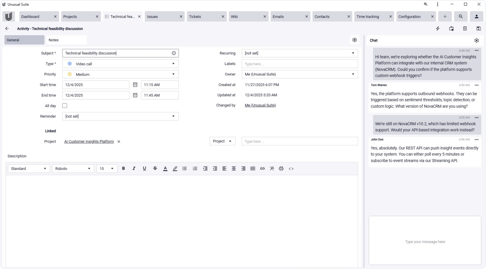 In the Unusual Suite, email is a dedicated module. Messages can be linked to relevant records, including attachments, tasks, and project references. AI features assist with summarizing content, extracting key information, and quickly retrieving what matters.