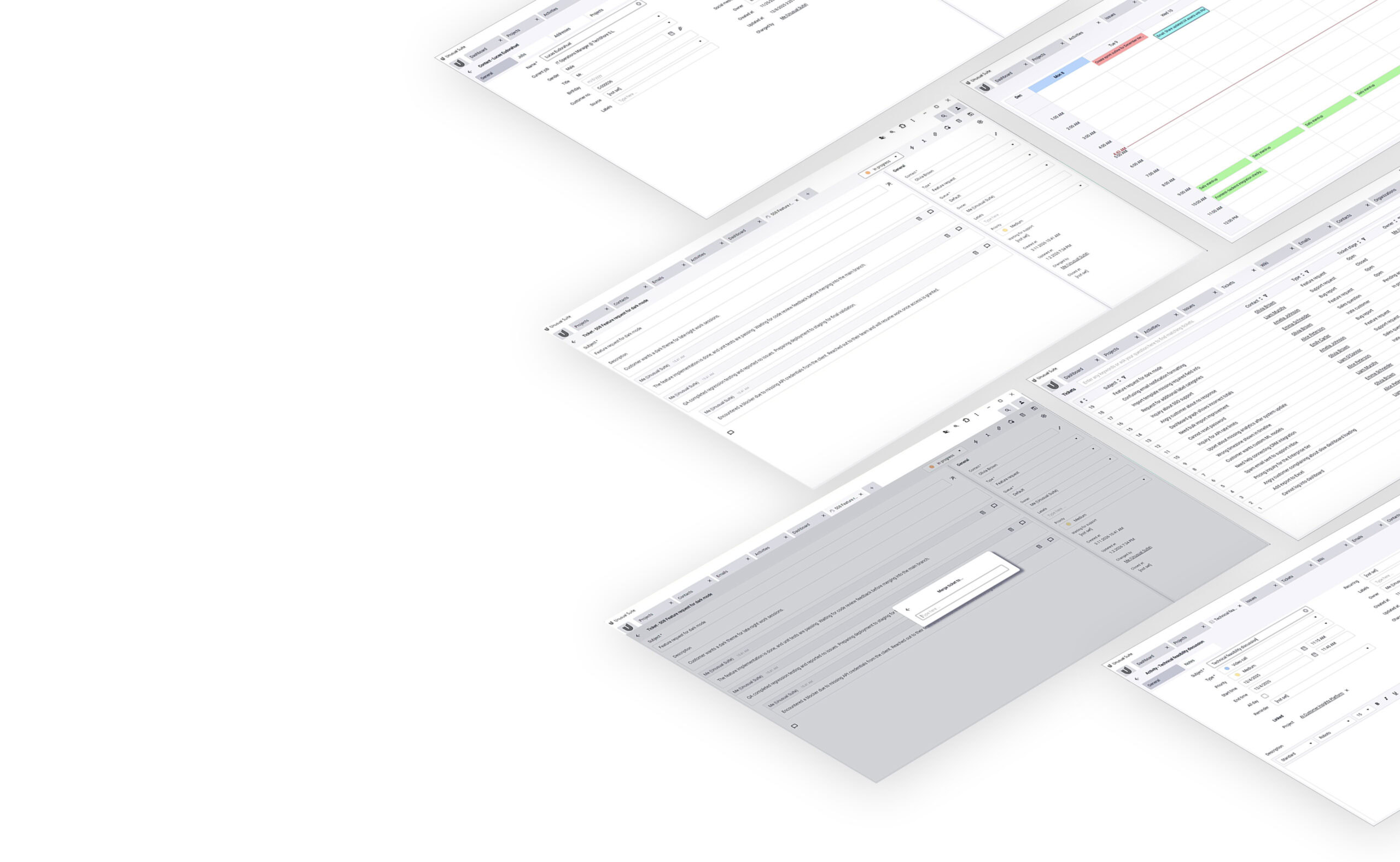 Aquí es exactamente donde Unusual Suite marca la diferencia. La plataforma conecta la gestión de tickets, los datos de CRM, el software de gestión de proyectos y la facturación en un único sistema. Los módulos son independientes pero pueden vincularse cuando sea necesario, lo que permite a las empresas crear flujos de trabajo estructurados manteniendo la flexibilidad.